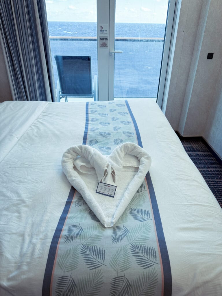 Norwegian Gem felt like luxury because we booked a Category SN Aft-Facing Penthouse Suite. This is where NCL wins. Unlike Celebrity’s version, this suite came with a real butler and concierge. We had a purple keycard that got us priority access everywhere. The room was incredible. The balcony on the back of the ship offered a 180-degree view of the wake. We really enjoyed the views from our balcony.